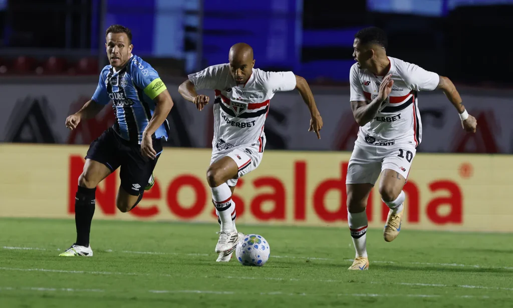 O São Paulo aproveitou a expulsão de Wagner Leonardo e viu seu trio de ataque ser decisivo ao vencer o Grêmio na noite desta quarta-feira, por 2 a 0, no Morumbis, pela terceira rodada do Campeonato Brasileiro. Lucas e Calleri anotaram os gols dos donos da casa. Luciano também teve participação direta no placar ao dar uma assistência, apesar de ter perdido o pênalti que levaria ao terceiro gol, parando em defesa de Weverton.