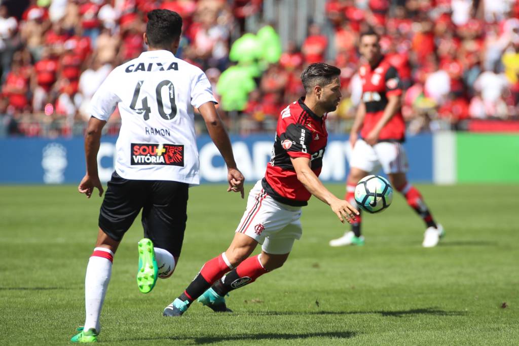 Diego protege a bola de Ramon na derrota do Flamengo para o Vitória (Foto: Gilvan de Souza/Flamengo)