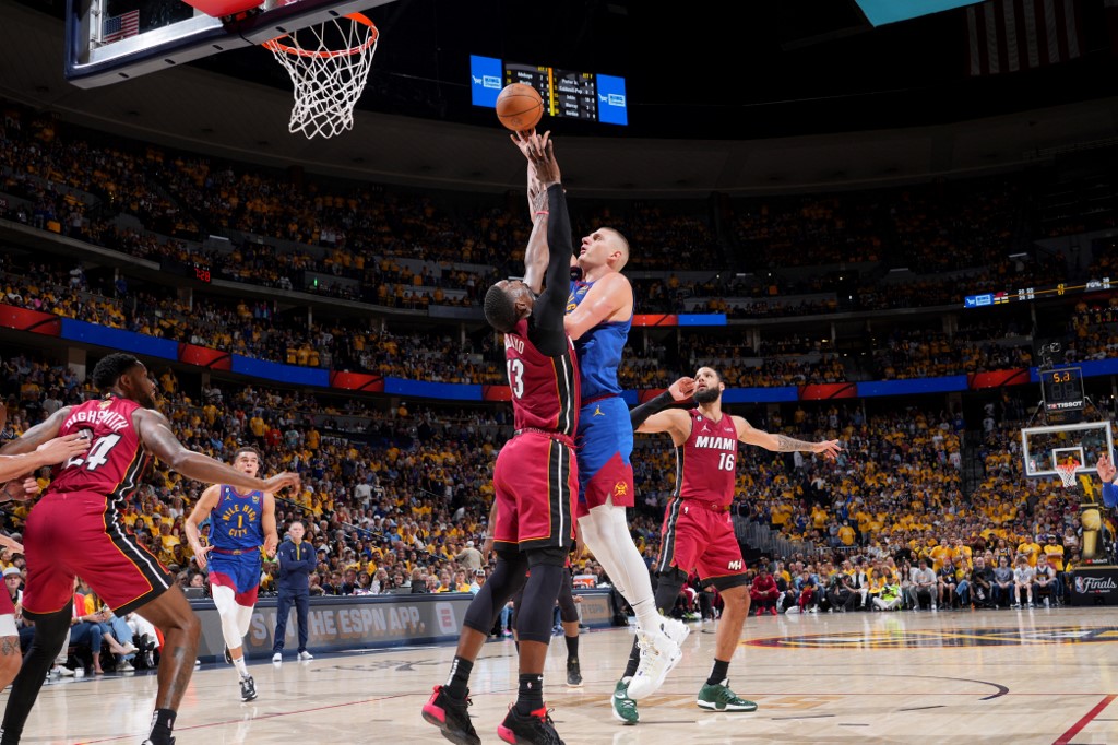 Liderado pelo magistral Nikola Jokic, que dominou o jogo com um triplo-duplo, o Denver Nuggets derrotou o Miami Heat por 104 a 93 na noite desta quinta-feira e abriu vantagem de 1 a 0 nas finais (de melhor de sete partidas) da NBA.