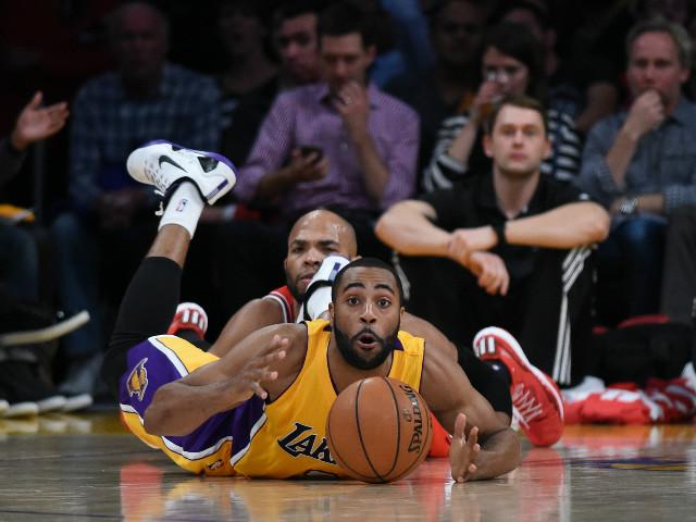 Jogo entre Lakers e Bulls acabou em disputa até no chão do Staples Center; mandantes fizeram 123 a 118 - Credito: AFP