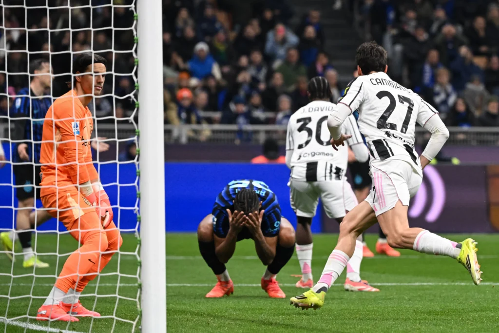 Aos 33 minutos, a Inter de Milão quase fez o segundo. Barella encontrou passe para Thuram, que deu de primeira para Zielinski. O meio-campista invadiu a área e finalizou, superando o goleiro, mas a zaga da Juventus afastou em cima da linha e impediu o gol. Com 41, Thuram cabeceou após cobrança de escanteio e Di Gregorio defendeu. Na sobra, Bastoni chutou, a bola desviou e bateu nas duas traves, dando tempo da zaga da Juve mandar para longe.