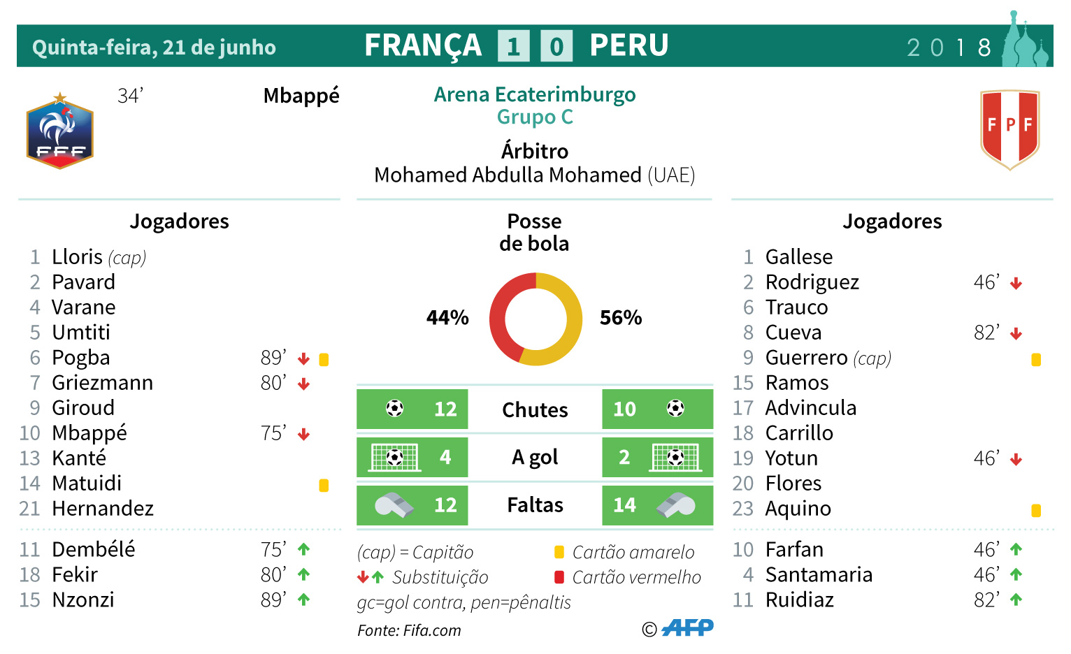 Cartão Amarelo: Matuidi e Pogba (França); Guerrero e Aquino (Peru)