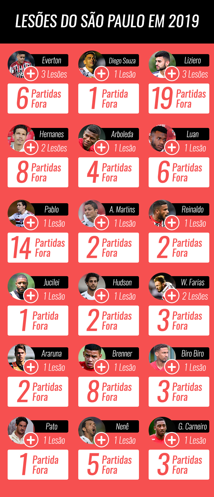Há ainda duas contusões na cabeça (concussão) e outras duas na região da coluna. Com esses casos somados, o São Paulo atuou desfalcado de ao menos um jogador em 30 dos 33 jogos da equipe na temporada 2019, contando com as duas partidas da Copa Flórida.