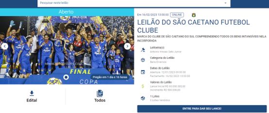 Com dívidas trabalhistas, fiscais, judiciais e extrajudiciais, o departamento de futebol do São Caetano está tentando ser vendido através de um leilão. Duas tentativas, em dezembro do ano passado e em janeiro, foram frustradas por falta de interessados. O lance inicial, que foi de R$ 90 milhões nas duas vezes, caiu para R$ 60 milhões no terceiro pregão, que terminará às 13 horas (de Brasília) desta quinta-feira. A redução é mais uma esperança para que apareça alguém disposto a investir no clube.