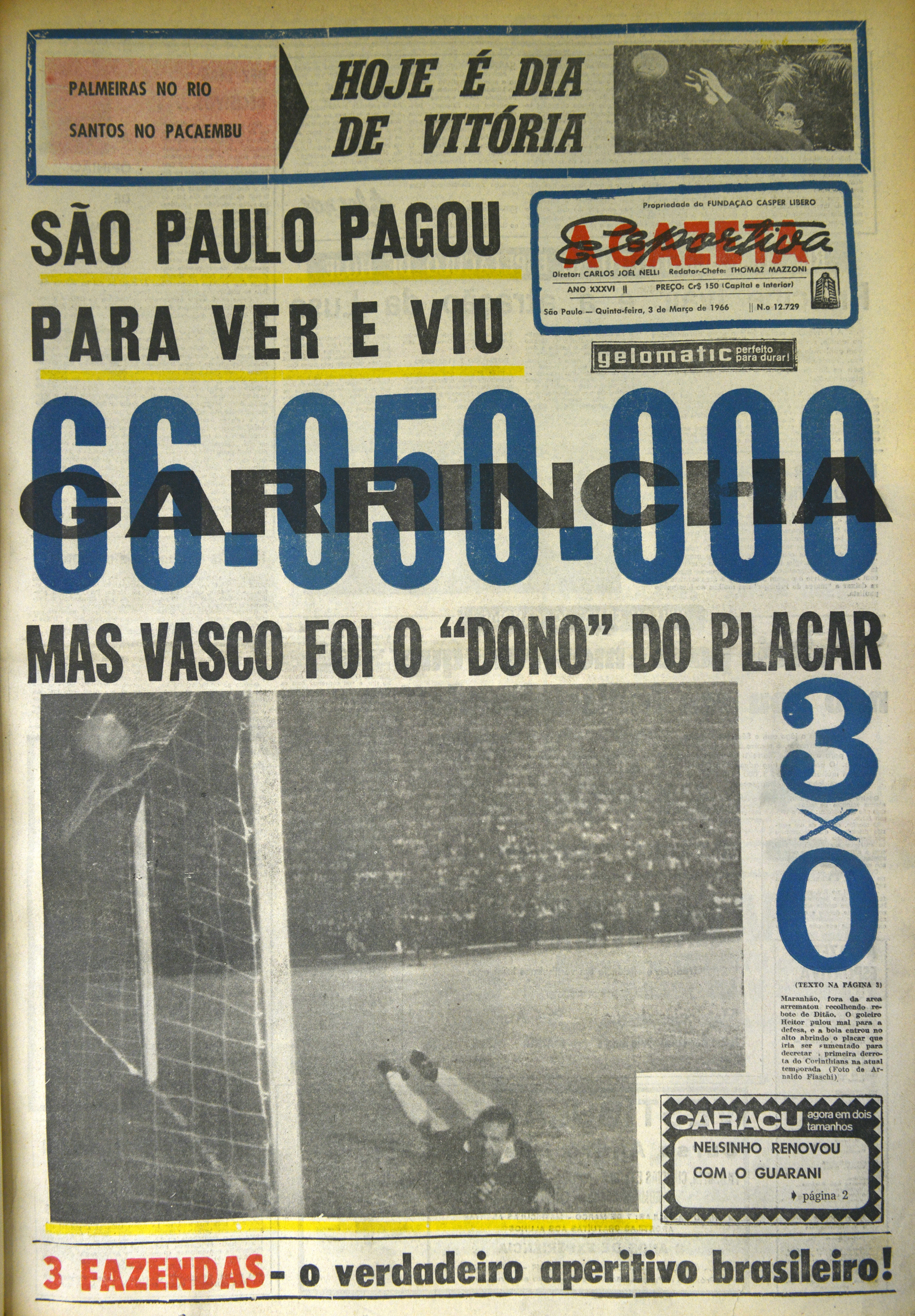 “E todas as esperanças se foram, com o Vasco esplendidamente estruturado, bem dirigido, conseguindo triunfo excepcional, embora atacando muito menos. Na realidade, a estreia de Garrincha, mesmo com a derrota, foi um grande acontecimento do futebol. Os vascaínos, encerrada a peleja, foram levar seu abraço a Mané Garrincha, enquanto a torcida corintiana, triste, deixava o Pacaembu, amargurada com os 3 a 0”, relatou A Gazeta Esportiva.