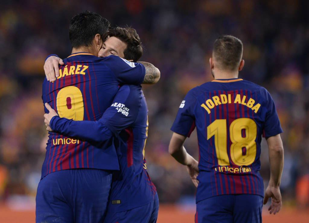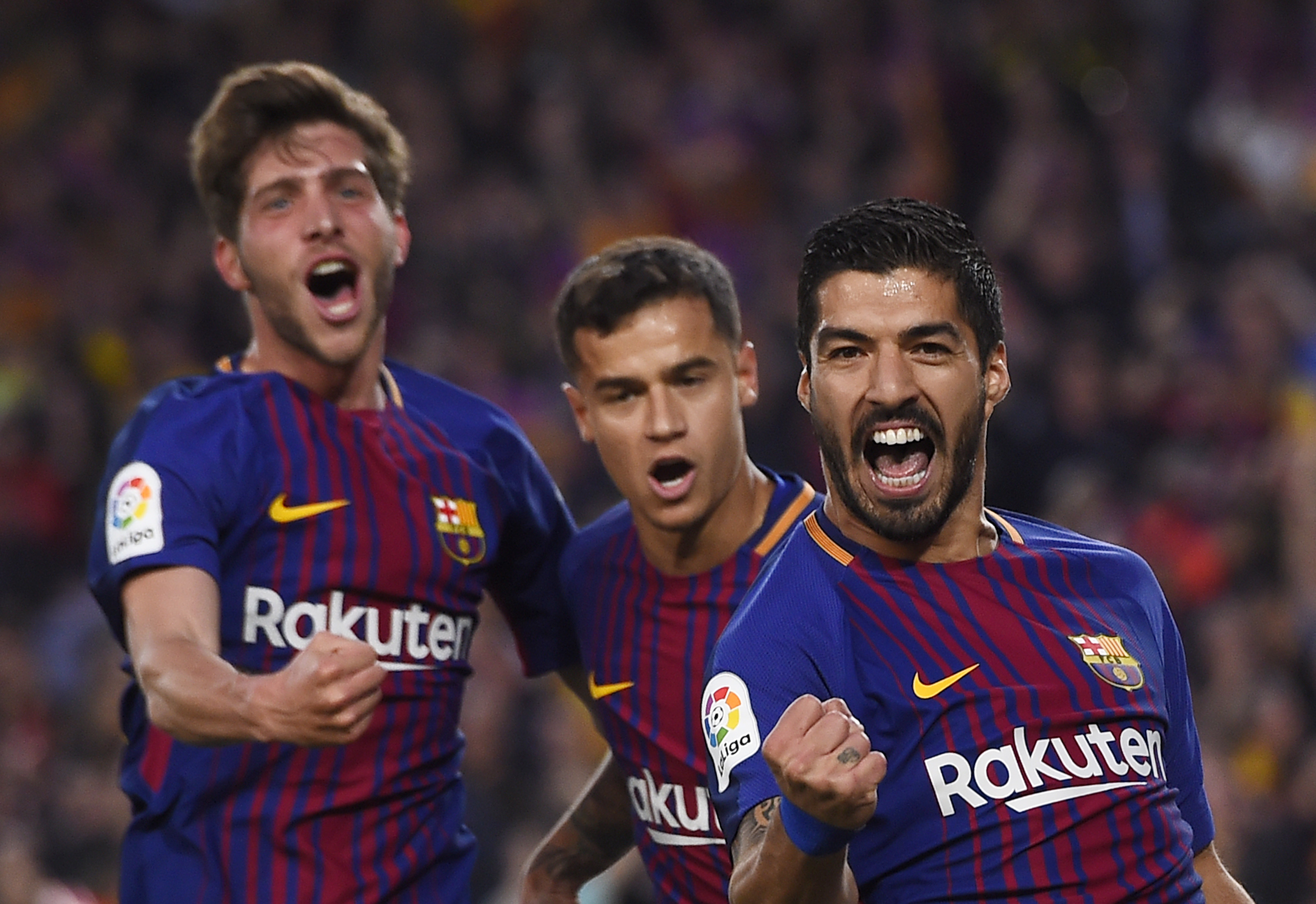 Barcelona's Argentinian forward Lionel Messi celebrates after scoring a goal during the Spanish league football match between FC Barcelona and Real Madrid CF at the Camp Nou stadium in Barcelona on May 6, 2018. / AFP PHOTO / LLUIS GENE14/14