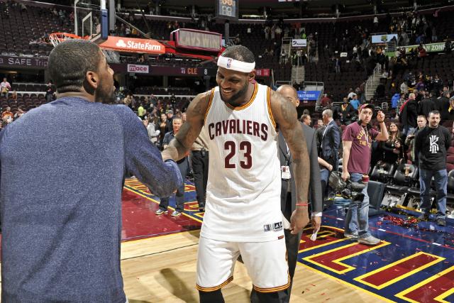 LeBron James e Kyrie Irving comemoram a 11ª vitória dos Cavaliers na NBA (Foto: David Liam Kyle) - Credito: AFP