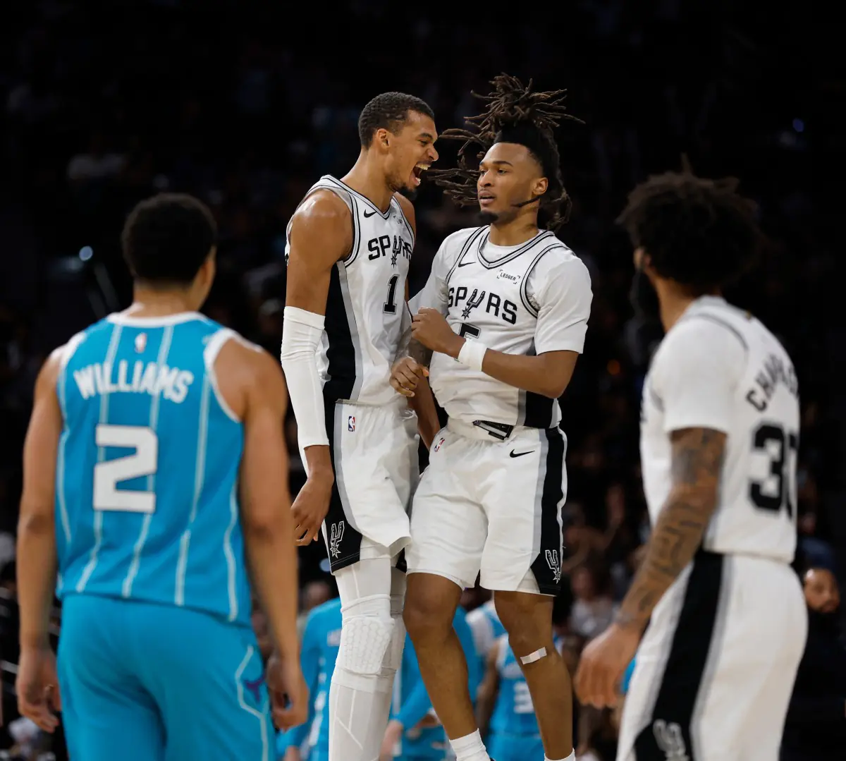 Victor Wembanyama marcou 32 pontos, a maior pontuação da partida, e pegou 12 rebotes neste sábado, liderando o San Antonio na vitória por 115 a 102 sobre o Charlotte, dando aos Spurs sua 17ª vitória em 19 jogos.
