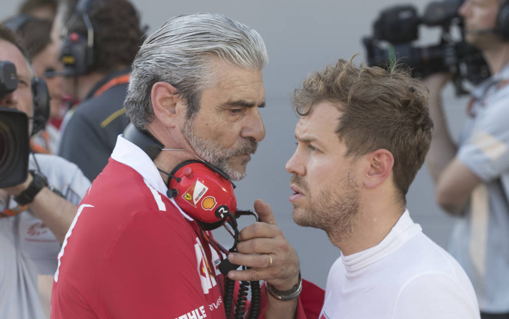 Vettel e Maurizio Arrivabene, chefe da Ferrari, conversando após o GP de Baku (Foto: VALDRIN XHEMAJ/AFP)