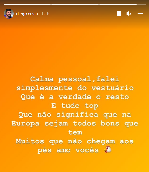 Explicação de Diego Costa sobre as críticas ao CT do Atlético-MG. (Foto: Divulgação/ Instagram/ Diego Costa)