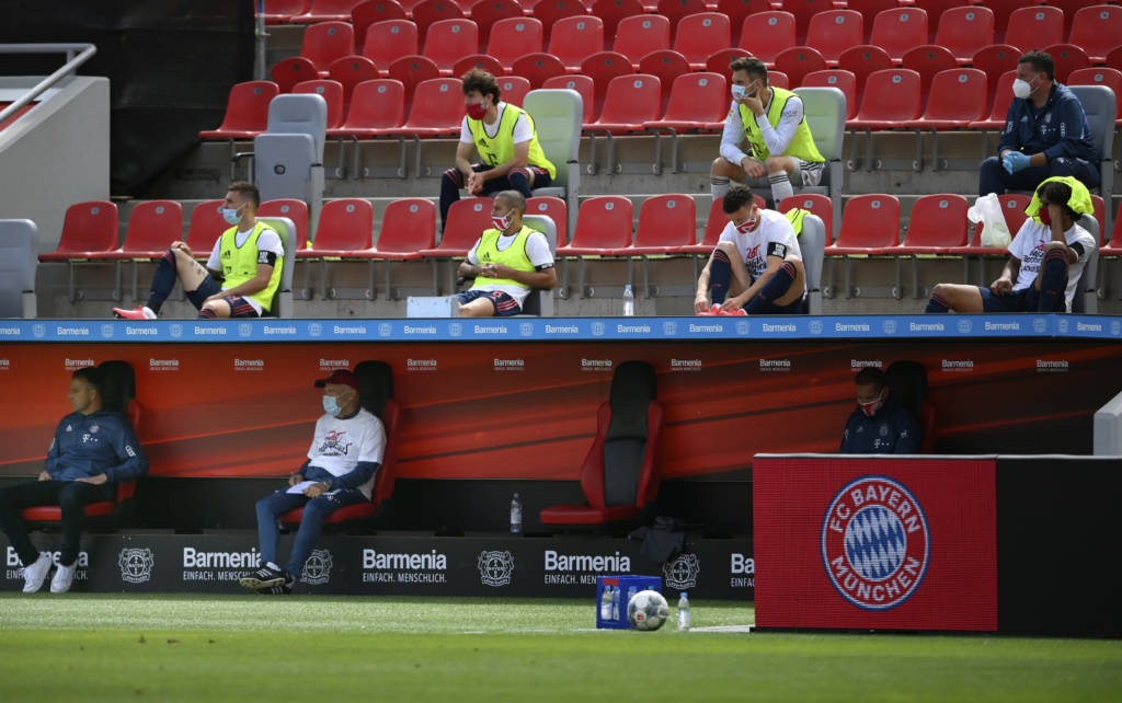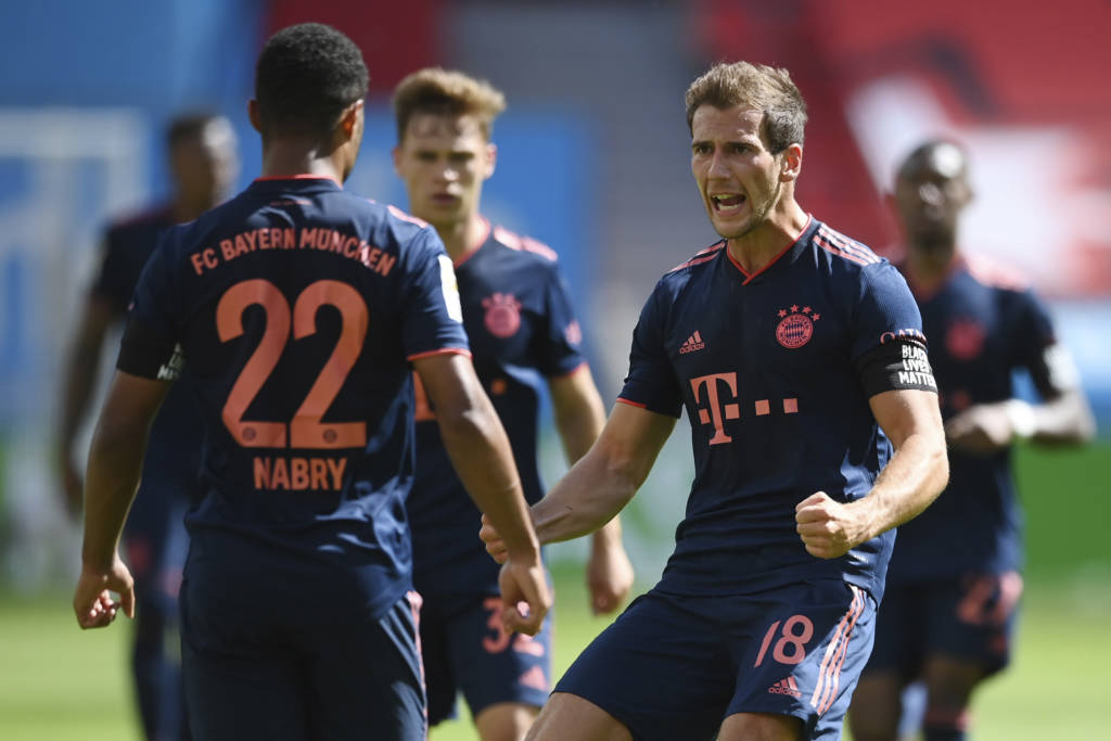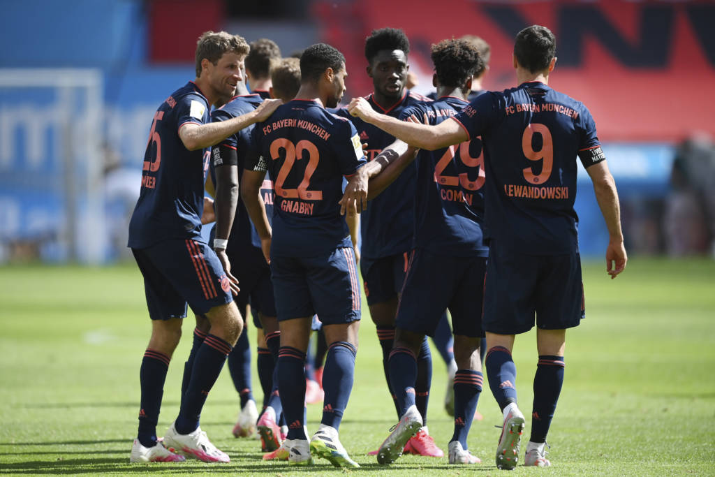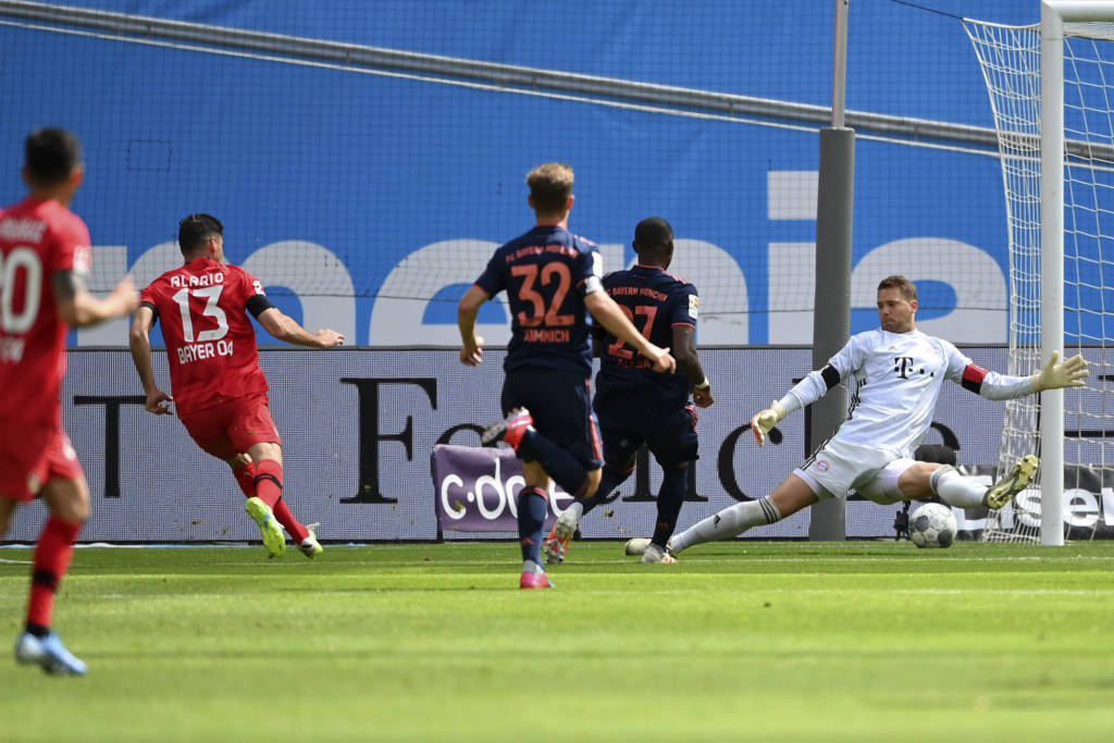 Bayern Munich's Polish forward Robert Lewandowski (C) heads to score his team's fourth goal during the German first division Bundesliga football match Bayer 04 Leverkusen v FC Bayern Munich on June 6, 2020 in Leverkusen, western Germany. (Photo by Matthias Hangst / POOL / AFP) / DFL REGULATIONS PROHIBIT ANY USE OF PHOTOGRAPHS AS IMAGE SEQUENCES AND/OR QUASI-VIDEO18/19