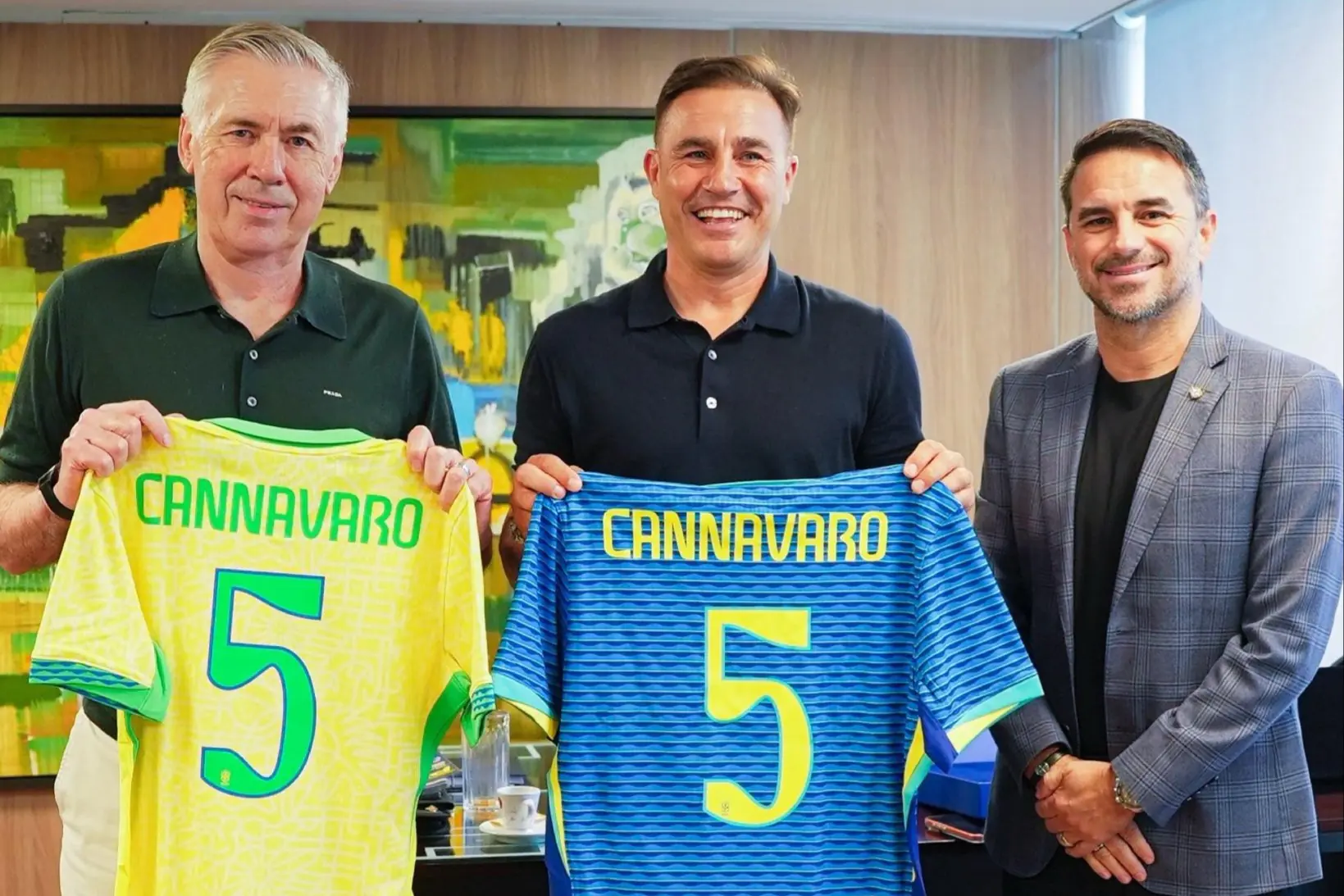 Cannavaro, atual treinador da Seleção do Uzbequistão, posou para foto ao lado do compatriota Carlo Ancelotti, treinador da Seleção Brasileira, e Rodrigo Caetano, coordenador de seleções da CBF.