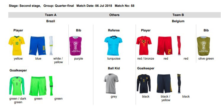 Já os goleiros Alisson, Ederson e Cássio voltarão a vestir o uniforme predominantemente verde usado na primeira fase. Nas oitavas de final, contra o México, o trio usou camisas, calções e meiões pretos.