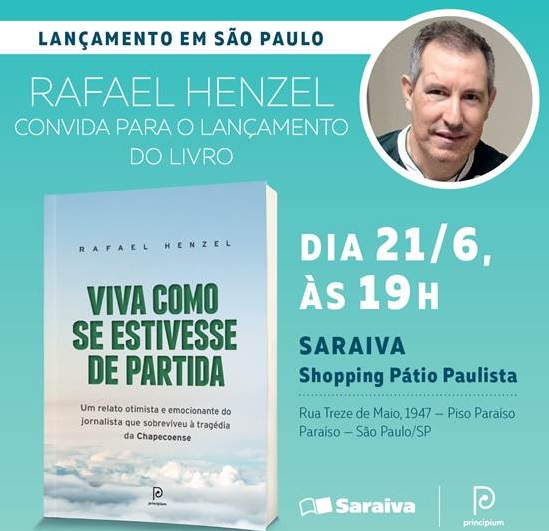 Será lançado, em São Paulo, no dia 20 de junho, o livro do jornalista Rafael Henzel, um dos seis sobreviventes do voo da Chapecoense que caiu na Colômbia e acabou vitimando 71 pessoas no final de 2016.