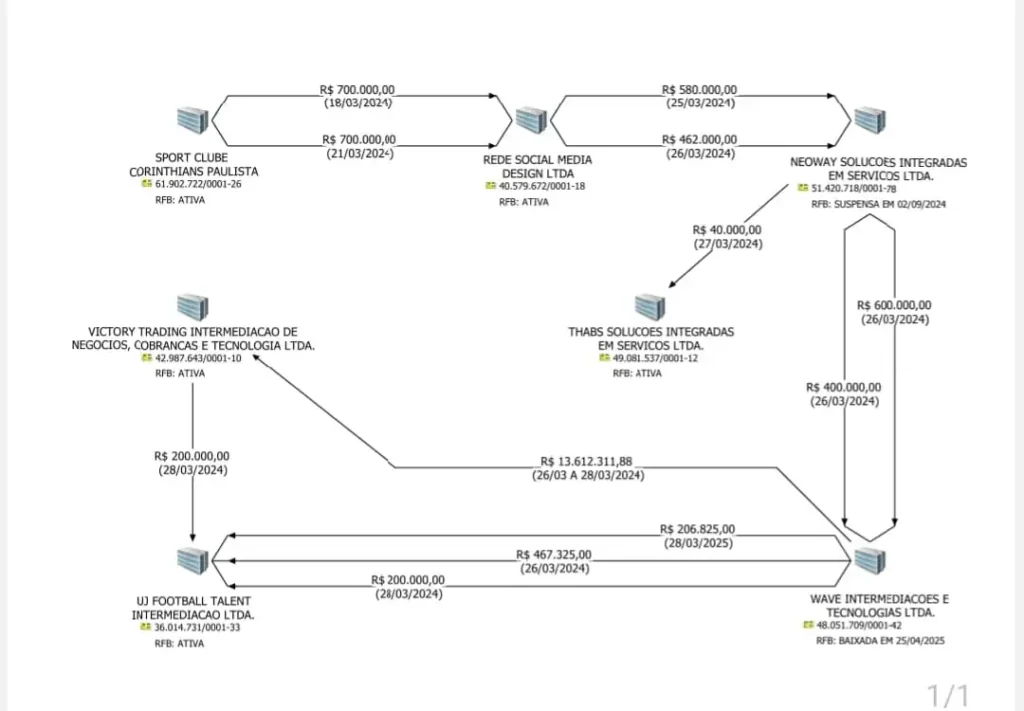 - O Corinthians transferiu para a Rede Social Media Design LTDA o total de R$ 1.400.000,00 nos dias 18 e 21 de março de 2024, por meio de duas transferências de R$ 700 mil.