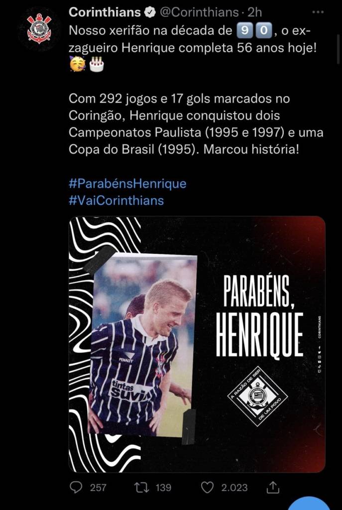 "Nosso xerifão na década de 90, o ex-zagueiro Henrique completa 56 anos hoje! Com 292 jogos e 17 gols marcados no Coringão, Henrique conquistou dois Campeonatos Paulistas (195 e 1997) e uma Copa do Brasil (1995). Marcou história!", escreveu o Corinthians em seu Twitter. Com os diversos protestos de torcedores, a publicação foi apagada horas depois.