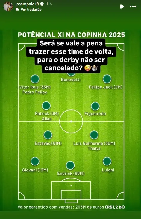 Na imagem divulgada por João Paulo Sampaio, aparece um time formado por jogadores da base alviverde que ainda poderiam atuar nesta edição Copinha, dentre eles Endrick e Estêvão, vendidos a Real Madrid e Chelsea, respectivamente.