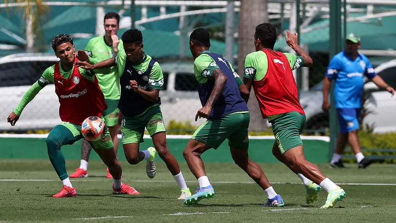 A provável escalação do Palmeiras conta com: Weverton; Marcos Rocha, Gustavo Gómez, Murilo e Piquerez (Vanderlan); Aníbal Moreno, Richard Ríos e Raphael Veiga; Mauricio, Facundo Torres e Estêvão (Foto: Cesar Greco/Palmeiras)5/8