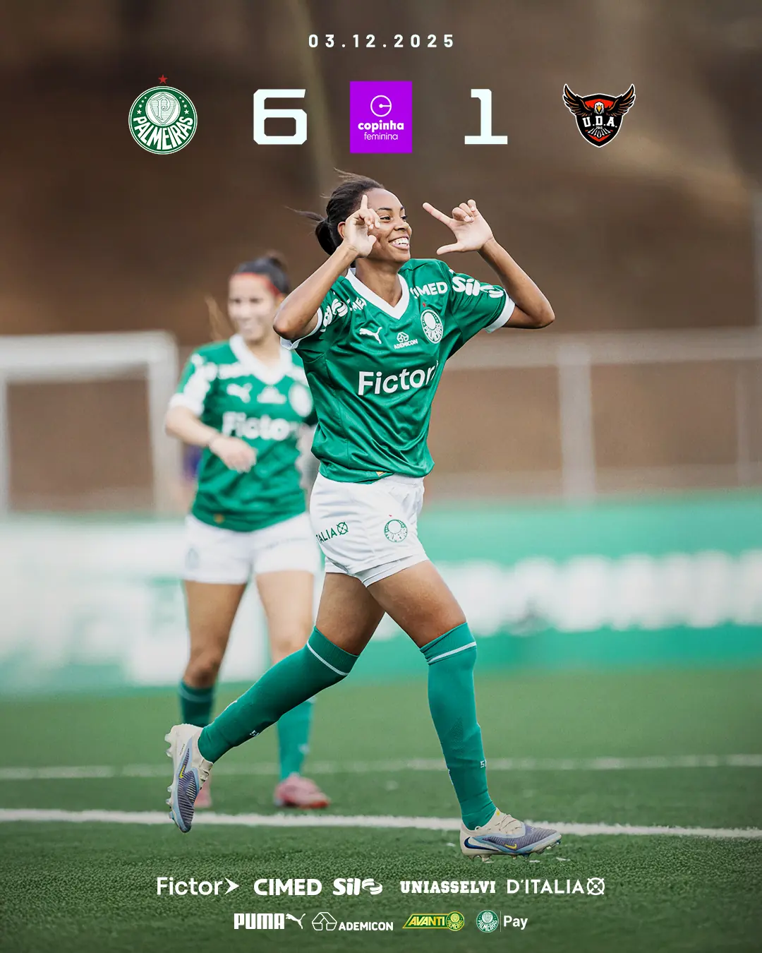Aos 18 minutos do segundo tempo, o Palmeiras chegou ao sexto gol. Após cobrança de escanteio de Clarinha, Stefanie acertou um chute forte antes de a bola quicar e fez seu segundo tento na partida. Aos 29, o UDA-AL marcou seu gol de honra: após passe de Kath, Olga, de apenas 15 anos, bateu colocado e descontou. No restante da partida, as palestrinas apenas administraram o placar, enquanto o técnico Hugo Macedo rodou o elenco.