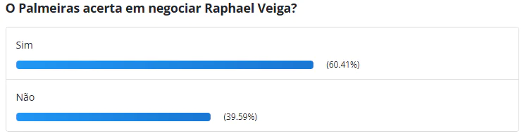 Dos votantes, 60,41% escolheram a opção "sim" para a pergunta "O Palmeiras acerta em negociar Raphael Veiga?", enquanto outros 39,59% discordaram e votaram em "não".