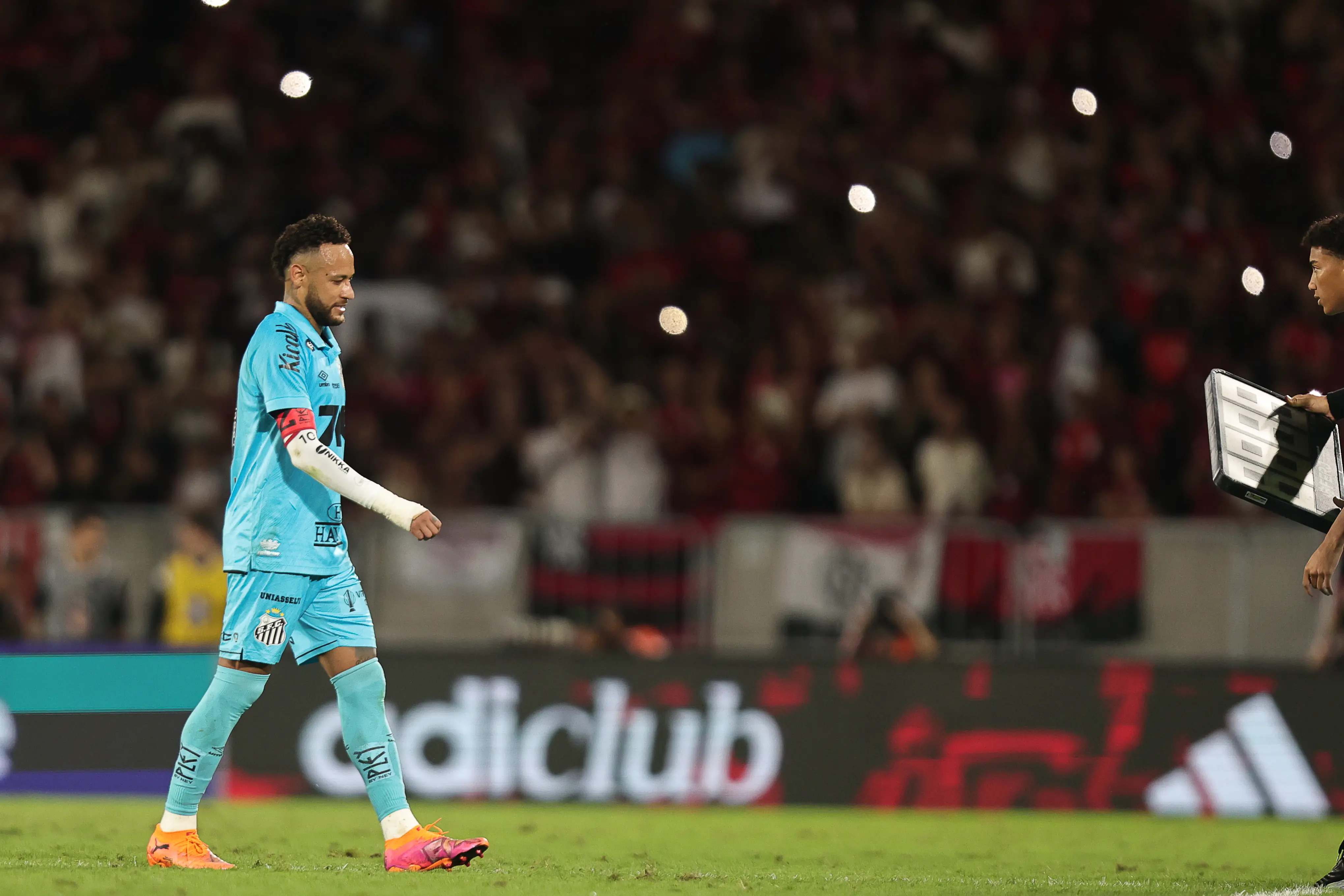 Ao ser substituído contra o Flamengo, Neymar reclamou com a comissão técnica e chutou um copo d’água, que foi lançado em direção ao banco de reservas. Ainda no vestiário do Maracanã, o jogador reconheceu o excesso por ter molhado os colegas e por ter ido direto para o túnel.