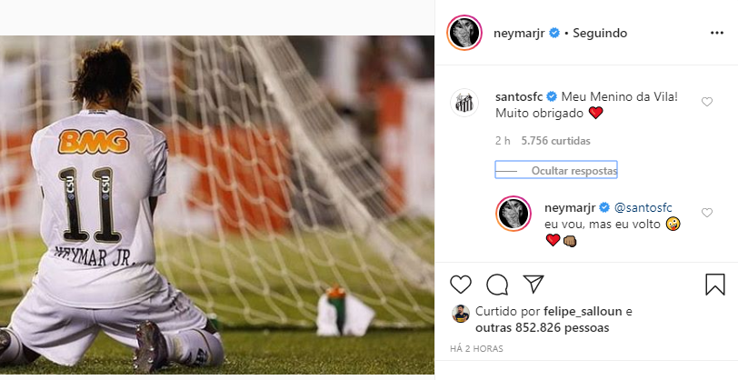 Na legenda da foto, Neymar citou uma das frases mais icônicas do Alvinegro Praiano: "É um orgulho que nem todos podem ter". O -perfil do Santos, então, comentou no post: "Meu Menino da Vila! Muito obrigado!". Em resposta, o atacante escreveu "eu vou, mas eu volto".
