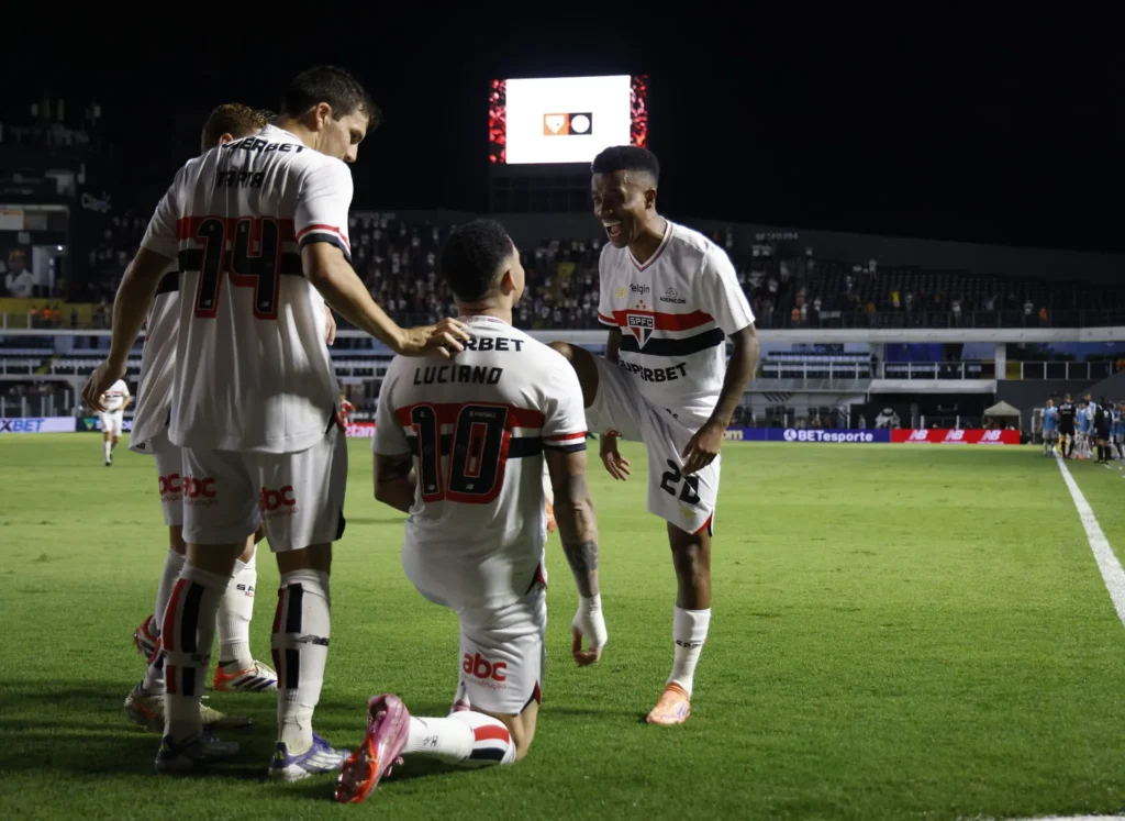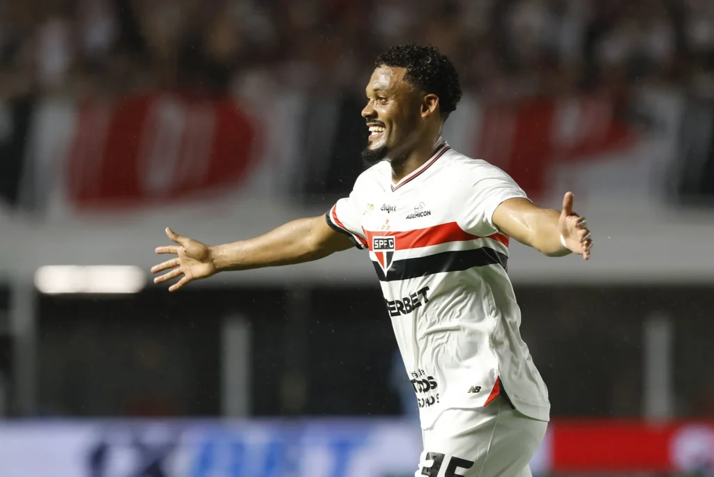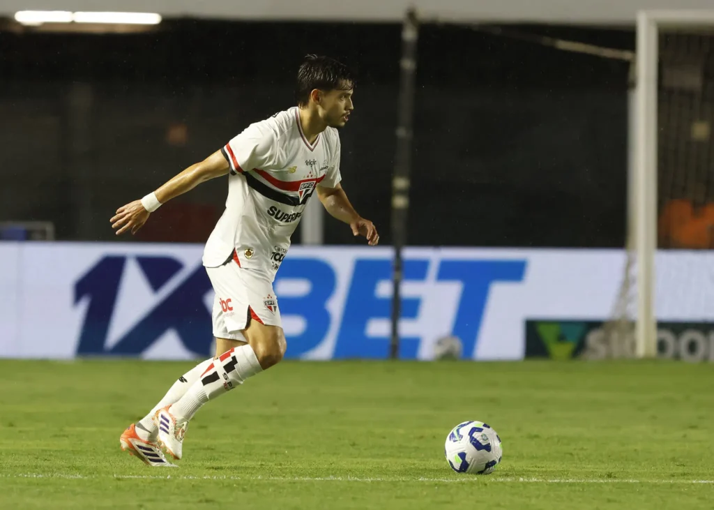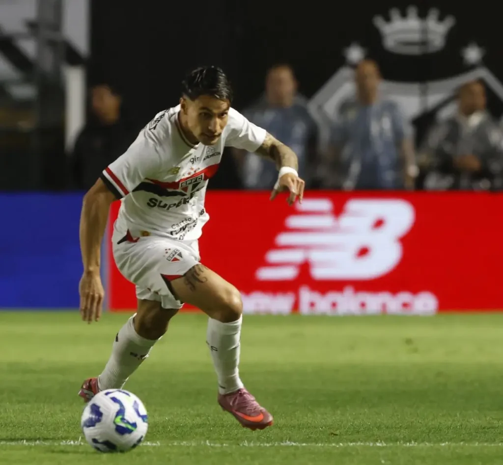 Sabino: além do gol que abriu o placar para o São Paulo, o zagueiro foi muito importante na saída de bola da equipe, abrindo espaços e atravessando as linhas de marcaçãon adversárias ao conduzir a bola para o campo de ataque. (Foto: Rubens Chiri/São Paulo FC)4/5