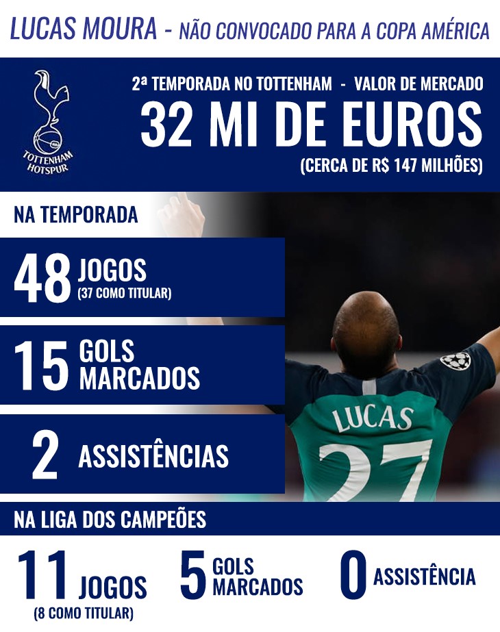 A incrível atuação, contudo, não comoveu Tite, que deixou Lucas de fora da lista de convocados para a Copa América. Em números gerais, o atacante disputou 48 partidas na temporada, 37 como titular, somando 15 gols e duas assistências. Na Liga dos Campeões, entrou em campo 11 vezes, oito delas no onze inicial, com cinco gols, mas sem assistências.
