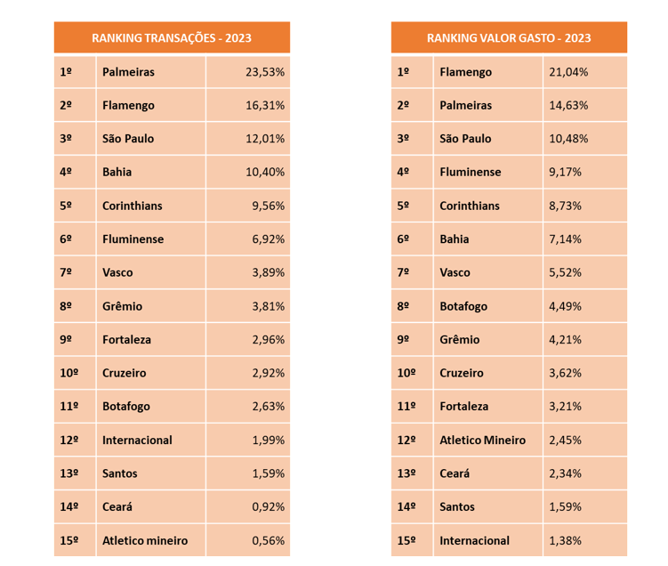 Neste caso, a análise foi feita com baste nas compras realizadas com cartões do Itaú e contemplam as transações realizadas no 1º semestre de 2023, na comparação com o mesmo período de 2022. Para delimitar os times analisados, foram considerados aqueles com as 15 maiores torcidas do país.