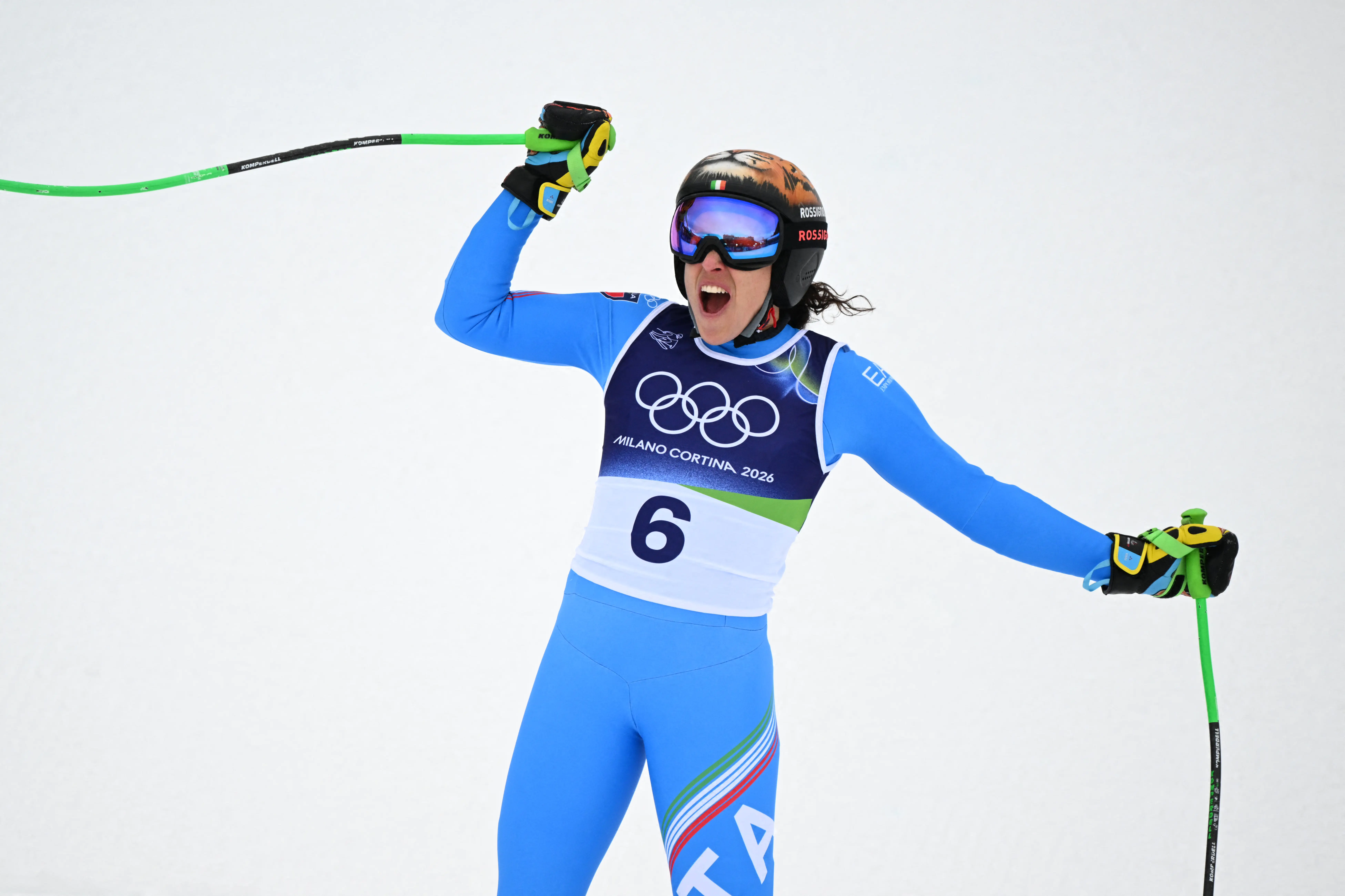 Apelidada de 'A Tigresa', a italiana rugiu pela pista em Cortina d'Ampezzo em 1min 23s 41 para conquistar seu primeiro ouro olímpico menos de um ano depois de sofrer uma dupla fratura na perna.